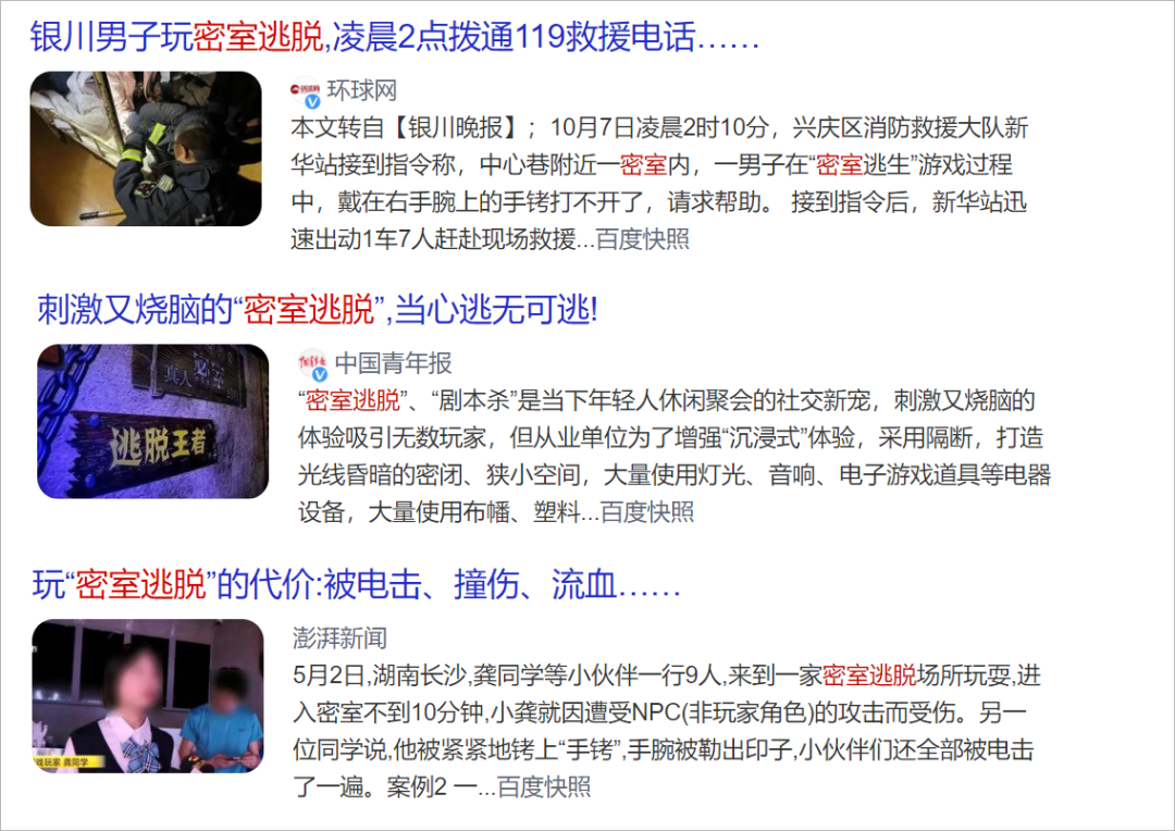 以“密室逃脱”为关键词检索出的部分负面新闻 | 百度资讯