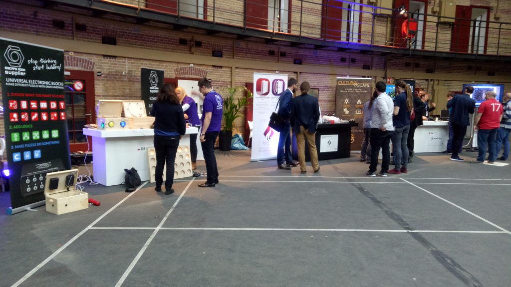 峰會主要分成舞台區跟展覽區,展覽區(Booth)大概有近20個攤位,其中包含了許多有趣的遊戲展示,大多數是荷蘭或是歐洲的團隊,內容包羅萬象,有機關製造商、VR遊戲、密室行政管理服務、與各種跳脫密室的實境遊戲創意展示!