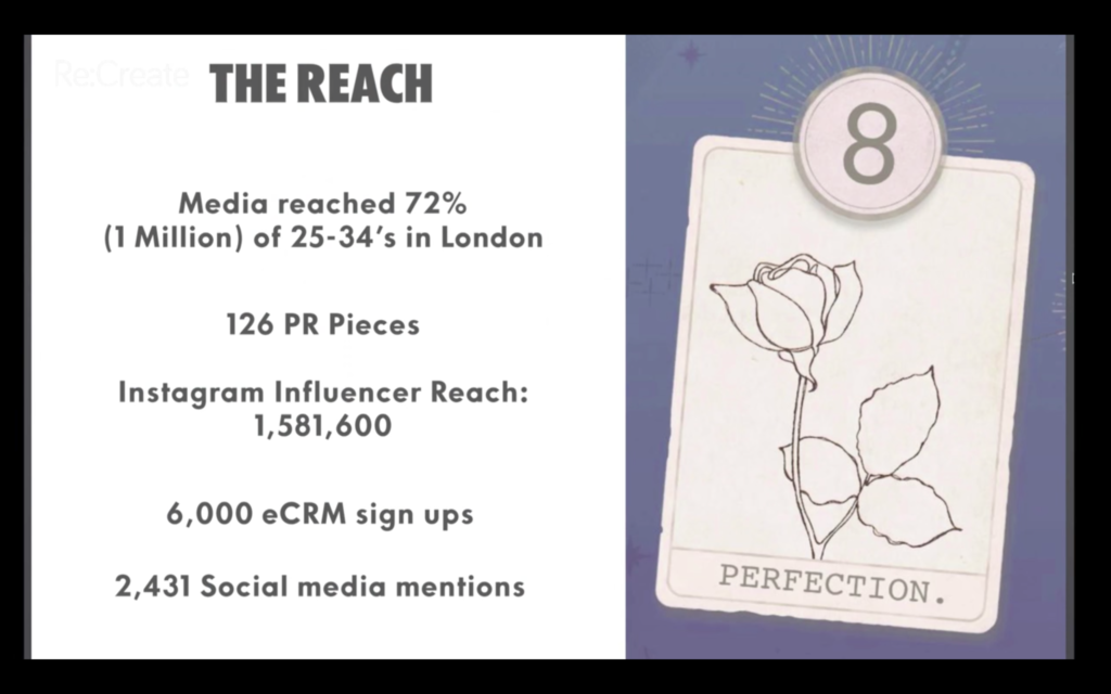 宣傳效益的部分,觸及72% 當地25-34歲的客群(約一百萬人),126則新聞媒體報導,Instagram觸及1,581,600人,6,000人在網站登記信箱以更新最新消息(eCRM),2,431則社群媒體貼文;實體轉換率,本次活動創造了 5,000瓶Absolut雞尾酒的體驗,包括了在酒吧關卡與結局關的體驗。