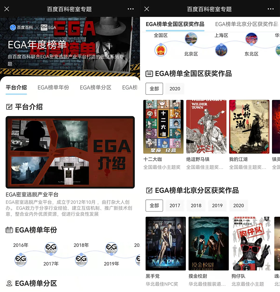 另外还要再补充一点,现在百度百科已为每届EGA年度全国优秀密室主题评选的获奖作品制作了专属榜单。