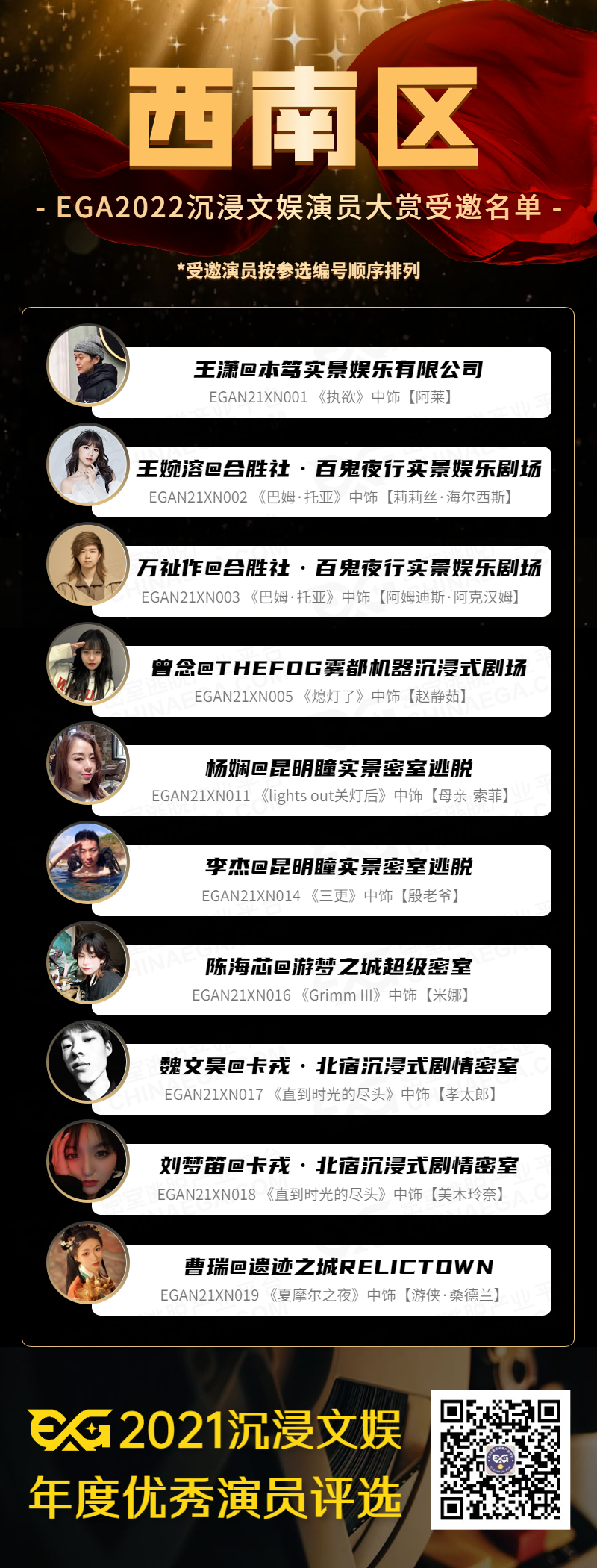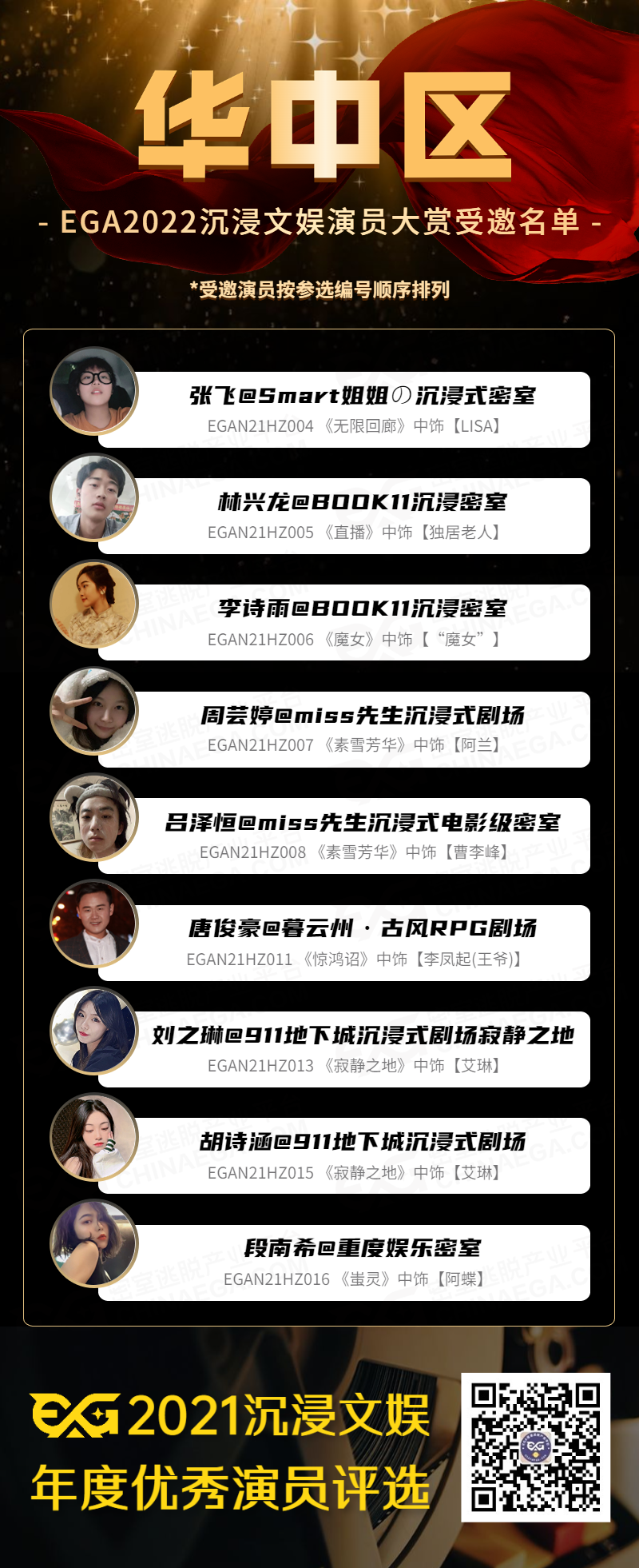 恭喜上述受邀演员演员,典礼展演邀请函领取方式:关注EGA密室产业平台,在公众号内回复“大赏邀请函”,填表并登记个人信息后领取。
