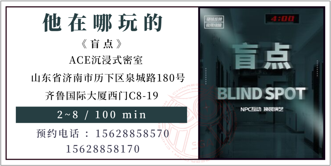 《盲点》是济南ACE沉浸式密室推出的原创非恐解谜主题,游戏前半段依靠NPC推进剧情,后半段则是以机械解谜为主。