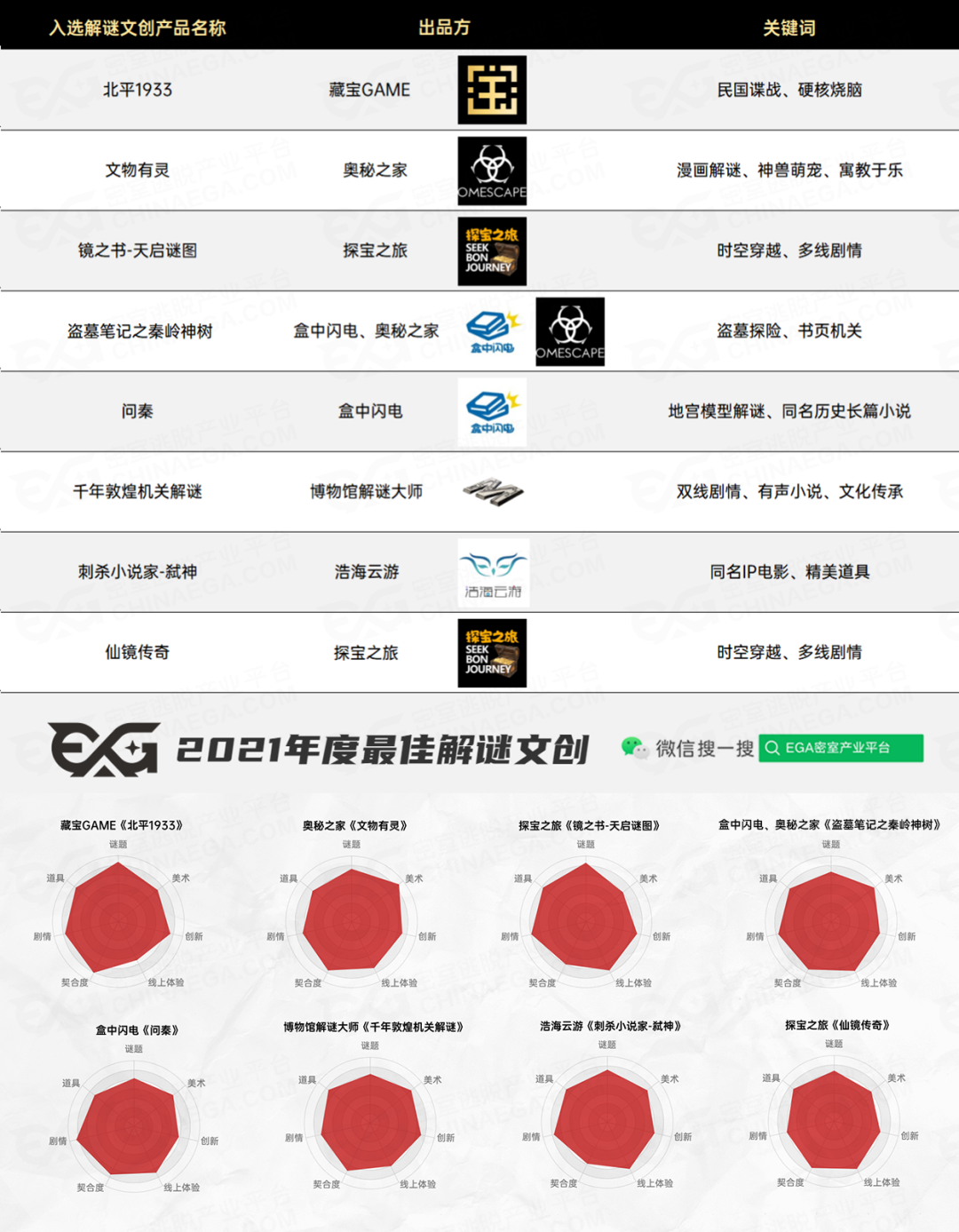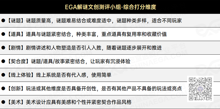 为了挖掘推荐优秀的“解谜文创”作品和团队,2020年初EGA成立“解谜文创测评小组”,并从第五届EGA年度评选开始为“解谜文创”设立奖项。