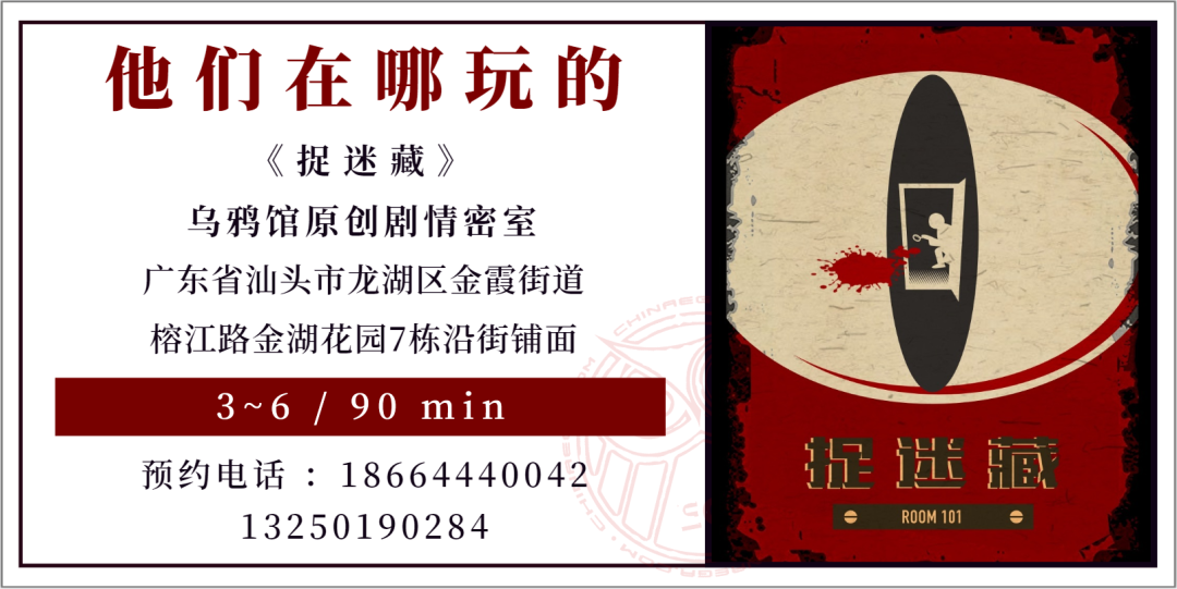 《捉迷藏》是汕头“乌鸦馆原创剧情密室”出品的机械解谜作品,身为门店运营三年来唯一上线的主题,体验过后我们一致认为该作绝对算的上此次远征发现的宝藏。