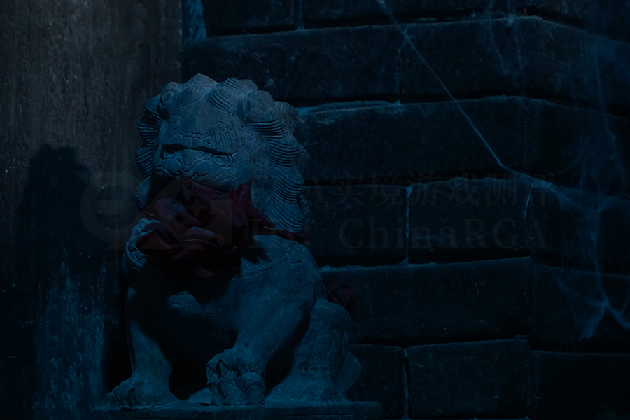 长走廊的靠外门窗做了绿植的延伸外景,一眼望去可以看见淡蓝色的月光穿过破旧的雕花镂空门窗洒在走廊,往前走去还能听见老鼠跑过、蝙蝠惊走和虫鸣鸟叫的环绕音效,而当你真正走向窗前又将发现自己置身一片黑暗,月夜探古宅的阴森氛围感营造得很棒。