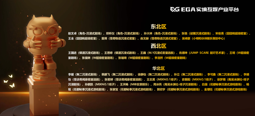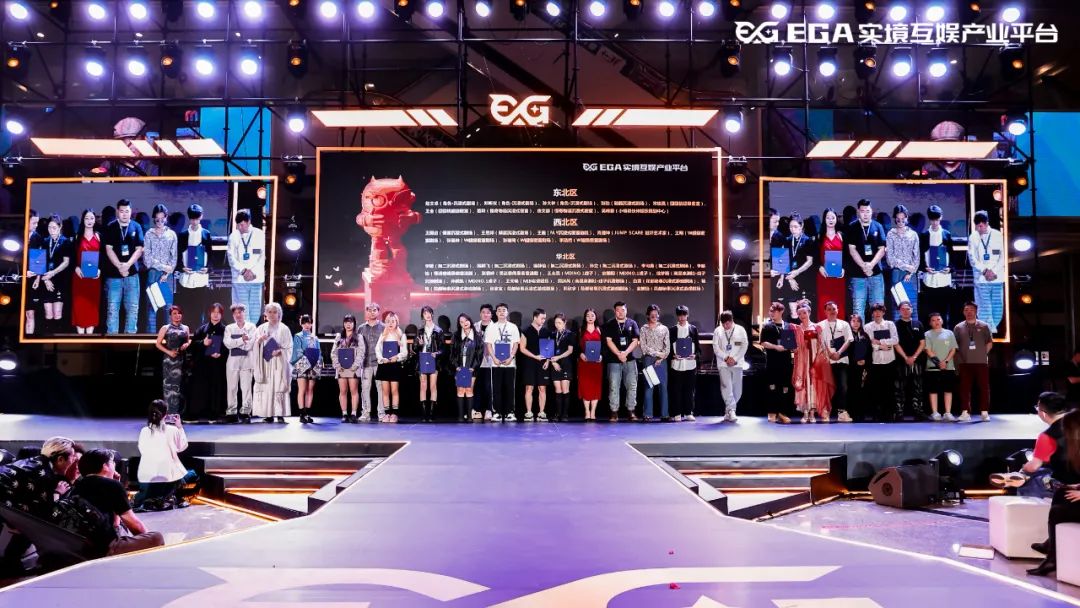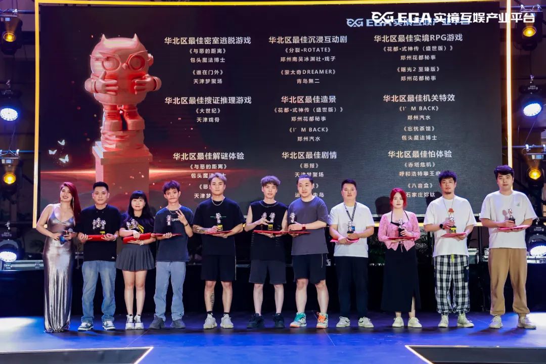 接下来揭晓的是东北区、西北区和华北区荣获EGA2022-2023年度优秀沉浸互动演员殊荣的演员名单(合照仅为到场领奖的演员代表)——