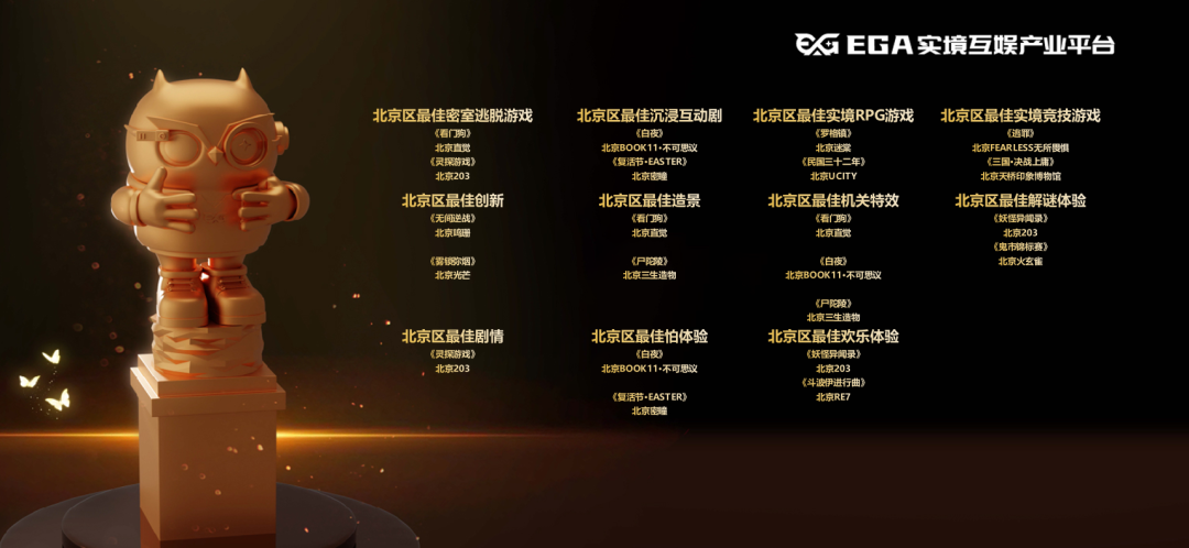 北京203出品的《妖怪异闻录》荣获EGA2022-2023年度全国最佳解谜体验、全国最佳欢乐体验,出品的《灵探游戏》荣获全国最佳密室逃脱游戏、全国最佳剧情