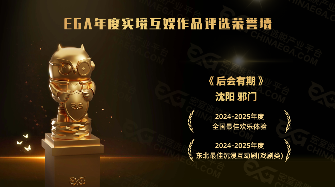 从《問米》到《钉子户2》再到《Thriller》,沈阳邪门密室已连续数年推出金奖佳作,从港式悬疑到东北幽默再到美式惊悚,其主题风格也始终是多元化的。今年邪门更是再度突破自我,凭借《后会有期》一举在EGA2024-2025年度评选中夺得全国最佳欢乐体验的殊荣,而这份荣誉,与主题背后的故事同样密不可分。