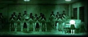 她出现在图书室内,出现在教室里,出现在舞蹈室里,出现在钢琴边,一遍弹奏着孤独的乐曲,一遍遍重复自己的上吊死亡,用近乎自虐的方式来找到解脱。