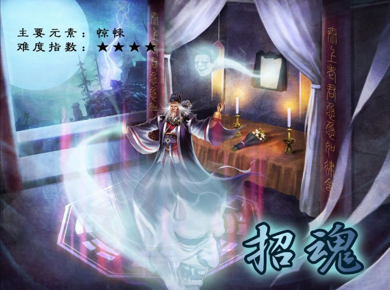 第一个玩的主题是《招魂》——四个人进去后,一个人拿着一个乐器,按照节奏你敲锣我打鼓他吹喇叭。
