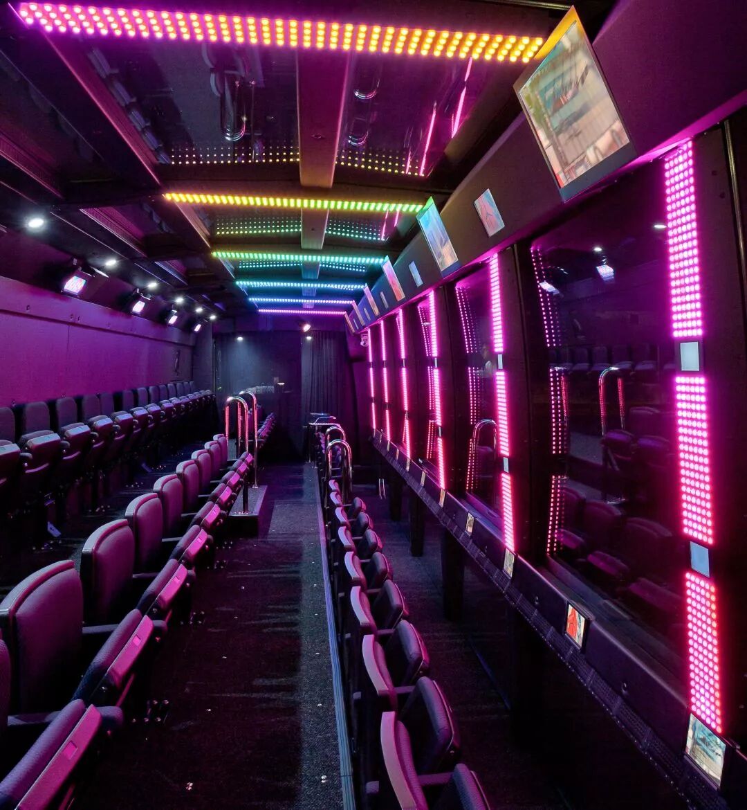 这些特别的客车价值可达数百万美元,是The Ride的“秘密武器”。每辆车均配备了40个平板显示器、3000个LED灯和环绕立体声座椅。乘客们面向窗户而坐,透过巨大的玻璃窗让人们能从一个新的、足够宽阔的视角去欣赏街边景致。