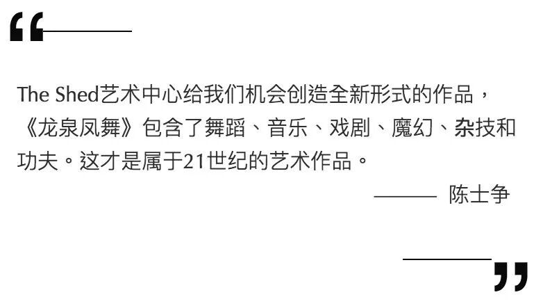 作为The Shed“棚屋”艺术中心开幕季的委约作品之一,《龙泉凤舞》这部耗时三年构思成形的功夫音乐剧,为艺术中心量身打造,既呼应了艺术中心鼓励跨界艺术创作的主旨,又彰显了华人移民丰富的想象力、创造力,和多元的文化。