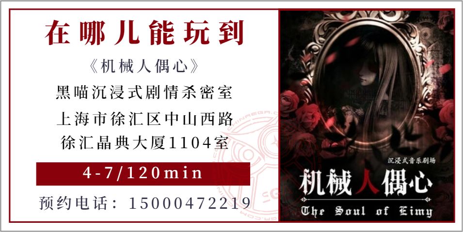 而这些服装,不仅统统都是店家从上海多个洛丽塔服装店中精挑细选的,同时还会向玩家提供头饰、胸针、眼镜、帽子、面具、手枪等丰富多彩的配饰及道具,单单一套服装的成本便远远超过了密室主题的门票价格。03游 戏 版 本 如果说《机械人偶心》的服装是“高端大气上档次”,那么该主题的内容则是“低调奢华有内涵”,并已开发出“4人版”、“6人版”、“7人版”和“节日版”等多种版本,且各有千秋。