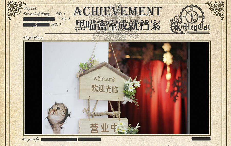 一方面,茶歇从用具到点心的精致,颇有一些“花园下午茶的范儿”;另一方面,则茶歇的形式很自然地融入了游戏主题的情境,让人感觉这仿佛也是游戏内容的一部分,进一步完善了玩家的游戏体验。 私人订制的成就档案 据介绍,游戏结束后,只要添加店铺的微信号,玩家就会收到独家生成的“黑喵密室成就档案”,其中包括了合照、任务完成情况和达成结局。