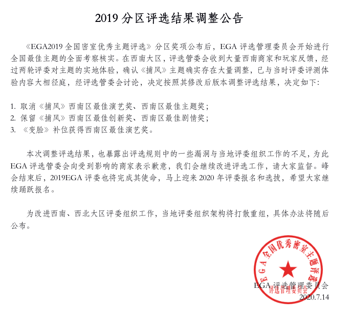 《EGA2019全国密室优秀主题评选》分区奖项公布后,EGA评选管理委员会开始进行全国最佳主题的全面考察核实。在西南大区,评选管委会收到大量西南商家和玩家反馈,经过两轮评委对主题的实地体验,确认《捕风》主题确实存在大量调整,已与当时评委评测体验内容大相径庭,经评选管委会讨论,决定按照其修改后版本调整评选结果,决定如下: